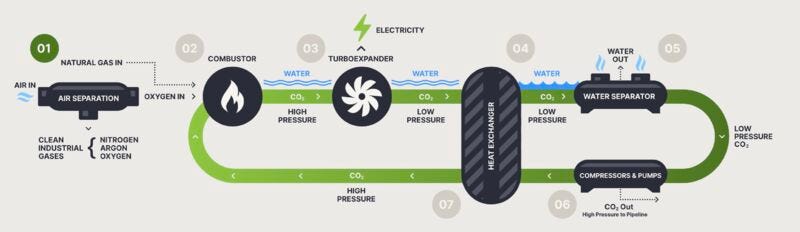 Enter Net Power. Instead of trying to separate the CO2 at the end of the process, they started separating the air at the start of the process and then feeding purified oxygen into the combustion process. This is a relatively easy process that has been around on a large scale for quite some time. By changing the input from “air” to purified oxygen the waste product is no longer a difficult to separate CO2 mixture, but rather an easy to separate mixture of CO2 and water.